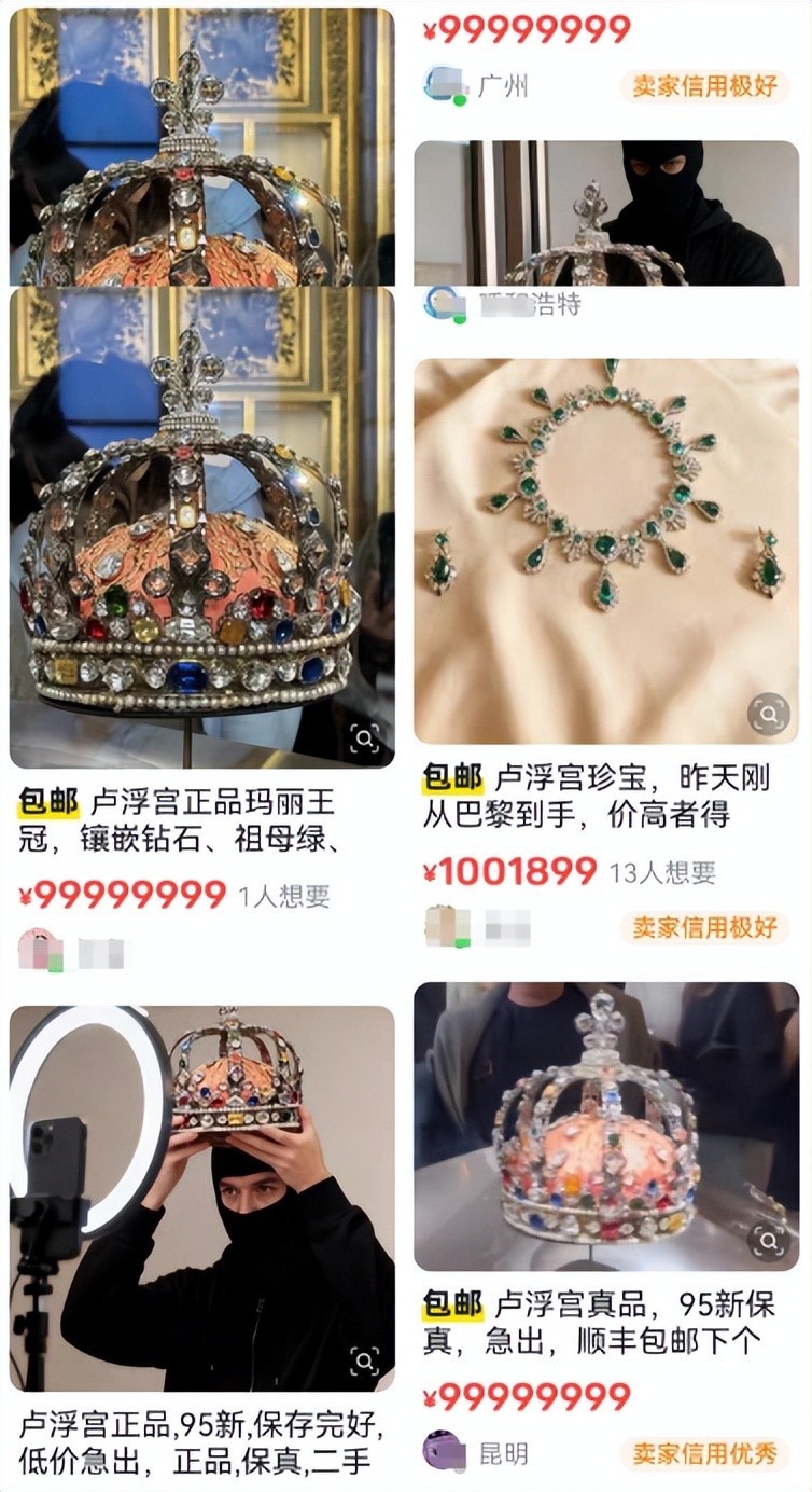 10月22日,记者在二手平台闲鱼上发现,有多个“卢浮宫博物馆被盗珠宝”售卖招引,标价从99万元到9999万元不等,招引案牍中还有“9.5新体育游戏app平台,现货在手、刚取货,廉价急出”等刻画。